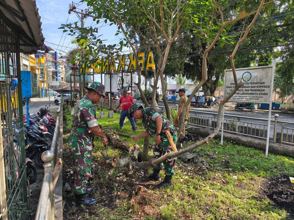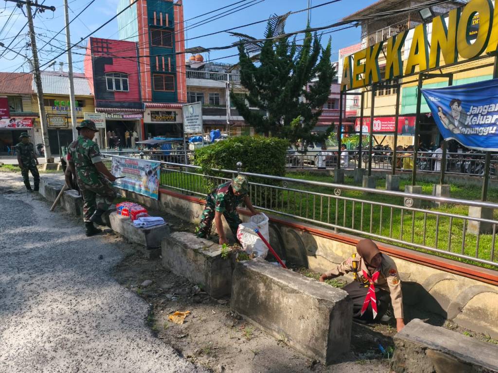 Menyambut HUT TNI ke-80, Koramil 01/AK Kodim 0209/LB melaksanakan kegiatan Bhakti Teritorial berupa pembersihan Taman Ikon Kota Aek Kanopan, Jl. Jenderal Sudirman, Aek Kanopan Timur, Kualuh Hulu.