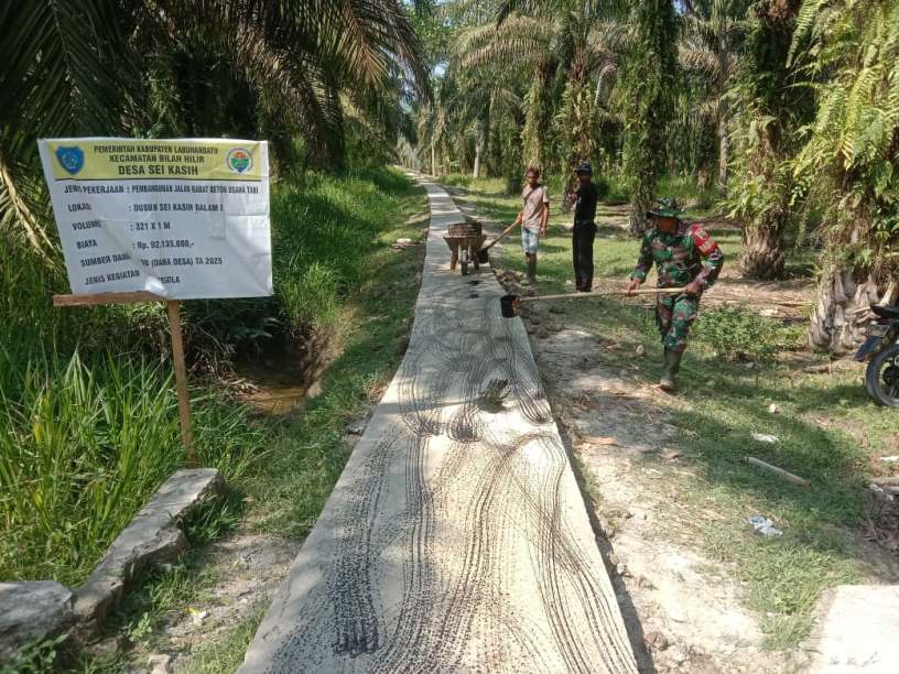 Labuhanbatu , kodim0209labuhanbatu – Babinsa Koramil 09/NL Serda Suyatno bersama masyarakat Dusun Sei Kasih Dalam I, Kecamatan Bilah Hilir melaksanakan kegiatan gotong royong membersihkan lingkungan sekaligus merawat akses jalan desa, Sabtu (27/9/2025).