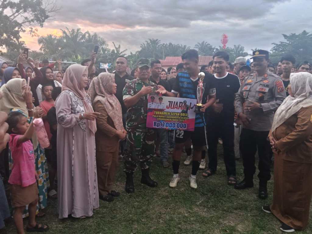 LABUHANBATU SELATAN , kodim0209labuhanbatu – Dalam suasana penuh semangat kebersamaan, Danramil 12/LP Kapten Inf J. Sembiring bersama tiga personel Koramil menghadiri laga final Open Turnamen Sepak Bola Piala Bupati Labuhanbatu Selatan yang digelar di Lapangan Dusun Simandiangin, Desa Sabungan, Kecamatan Sungai Kanan, Selasa (07/10/2025). Pertandingan tersebut mempertemukan dua tim terbaik, Elang Panser FC (Silangkitang) melawan Kalong FC (Langga Payung), yang berakhir dengan kemenangan Kalong FC melalui adu penalti 4–2.
