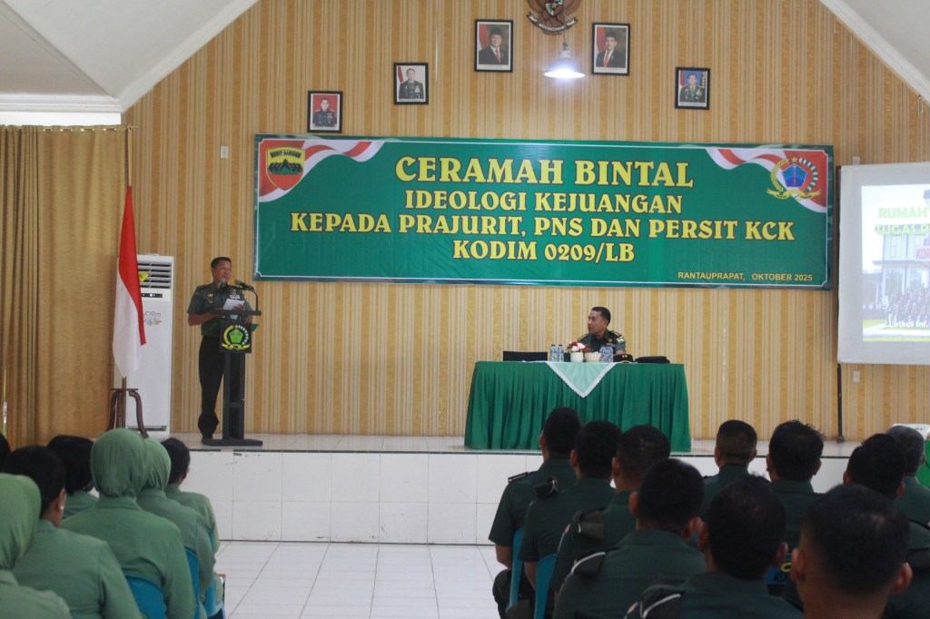 Labuhanbatu , kodim0209labuhanbatu – Dalam rangka membentuk prajurit dan keluarga besar TNI yang berkarakter kuat, disiplin, serta berakhlak mulia, Kodim 0209/Labuhanbatu menggelar kegiatan Ceramah Pembinaan Mental (Bintal) Ideologi Kejuangan bagi Prajurit, PNS, dan Persit Kartika Chandra Kirana Cabang XXXVI Kodim 0209/LB. Kegiatan berlangsung di Aula Manunggal Makodim 0209/LB, Jalan Abdul Aziz, Kecamatan Rantau Utara, Kabupaten Labuhanbatu, Senin (23/10/2025).