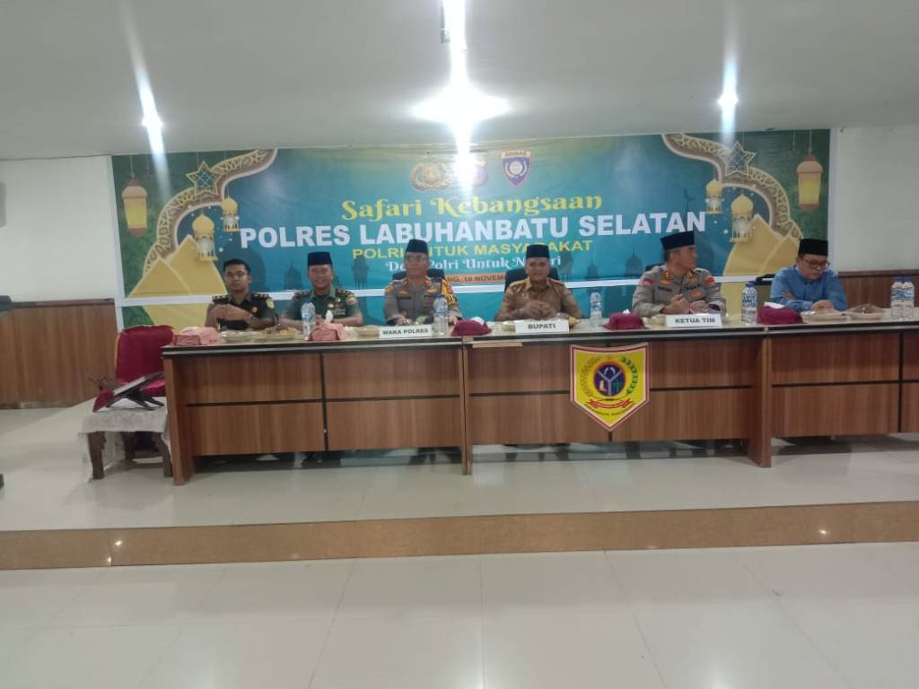 Acara yang digagas Polres Labuhanbatu Selatan ini turut dihadiri Ketua Tim Safari Kebangsaan AKBP Hartono, SH., MH., Wakapolres Kompol Ramses Samosir, SH., MH., Plh Sekda Labusel Drs. Fuadi, MAP, unsur Kajari, para pimpinan OPD, tokoh ormas, OKP, serta tamu undangan lainnya. Kegiatan diawali pembacaan ayat suci Al-Qur’an kemudian dilanjutkan sambutan Wakapolres yang menekankan pentingnya ruang dialog kebangsaan guna memperkuat cinta tanah air dan menjaga kerukunan masyarakat di tengah dinamika sosial.