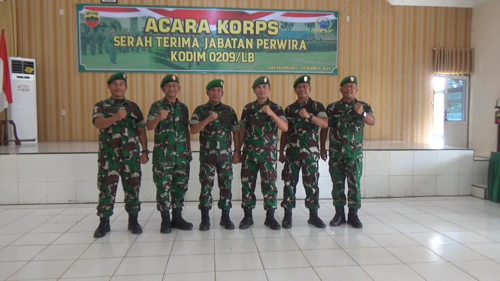 Labuhanbatu , kodim0209labuhanbatu— Kodim 0209/Labuhanbatu melaksanakan Korps Serah Terima Jabatan (Sertijab) Perwira sebagai bagian dari dinamika organisasi dalam meningkatkan profesionalisme satuan. Kegiatan berlangsung di Aula Bina Manunggal dan dipimpin Kasdim 0209/LB Mayor Inf S.H. Tanjung mewakili Dandim Letkol Inf Yudy Ardiyan Saputro, S.I.P, Selasa (2/12/2025). Sertijab dilakukan untuk jabatan Danramil 03/SB dari Mayor Inf J. Sembiring, S.H kepada Mayor Inf Chrisman Limbong, S.I.P sebagai bagian dari pembinaan karier dan kesinambungan kepemimpinan.