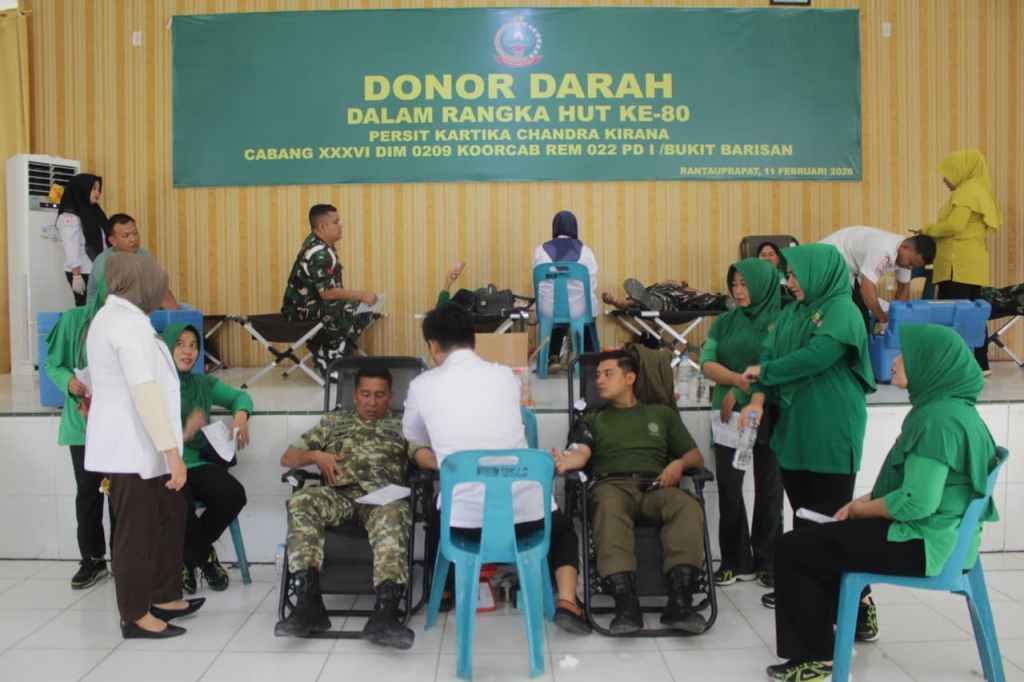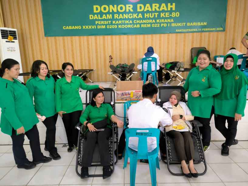 Labuhanbatu , kodim0209labuhanbatu — Dalam rangka memperingati Hari Ulang Tahun ke-80 Persit Kartika Chandra Kirana, Persit KCK Cabang XXXVI Dim 0209 Rem 022 PD I/Bukit Barisan berkolaborasi dengan Kodim 0209/Labuhanbatu menggelar kegiatan donor darah yang berlangsung di Aula Manunggal Makodim 0209/Labuhanbatu, Jalan Abdul Aziz, Kelurahan Padang Matinggi, Kecamatan Rantau Utara, Rabu (11/02/2026).