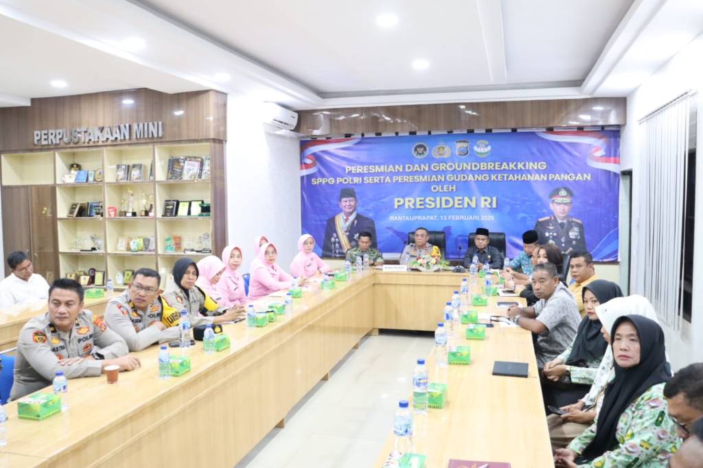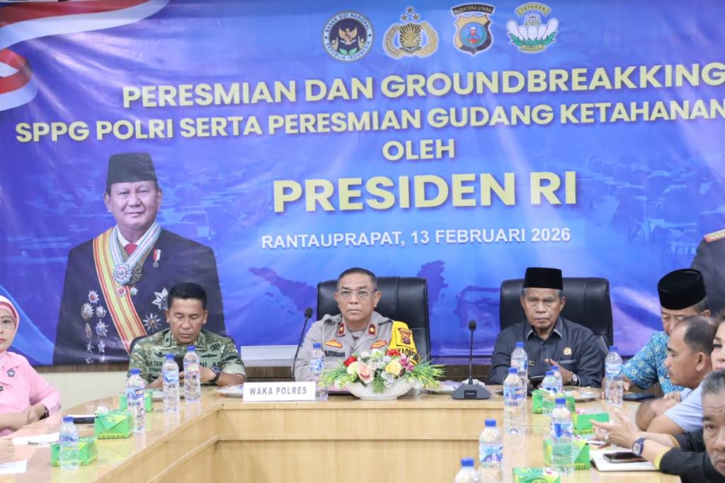 Labuhanbatu , kodim0209labuhanbatu – Kodim 0209/Labuhanbatu melalui Kasdim 0209/LB Mayor S.H. Tanjung menghadiri Zoom Meeting Peresmian dan Groundbreaking 1.179 Satuan Pelayanan Pemenuhan Gizi (SPPG) serta Peresmian 18 Gudang Ketahanan Pangan Polri oleh Presiden Republik Indonesia. Kegiatan berlangsung di Aula Tunggal Panaluan Mapolres Labuhanbatu, Jalan MH. Thamrin, Rantauprapat, Jumat (13/2/2026).