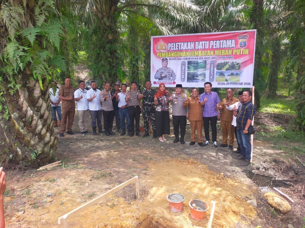 Kegiatan tersebut turut dihadiri Wakil Bupati Labuhanbatu Selatan Syahdan Purba Siboro, S.H., Kapolres Labuhanbatu Selatan AKBP Aditya SP Sembiring Muham, S.I.K., Kapolsek Torgamba AKP Samsul Azhar, S.H., Ketua DPRD Labuhanbatu Selatan Ari Winata, Wakil Ketua DPRD Irma Suryani, S.H., M.H., Camat Torgamba Boy Gusman Aidil Salam, S.E., unsur perusahaan, perangkat desa, serta insan pers. Dalam sambutannya, Kapolres Labuhanbatu Selatan menyampaikan apresiasi kepada seluruh pihak yang telah berkolaborasi mewujudkan pembangunan Jembatan Merah Putih sebagai wujud kepedulian bersama terhadap kebutuhan masyarakat.