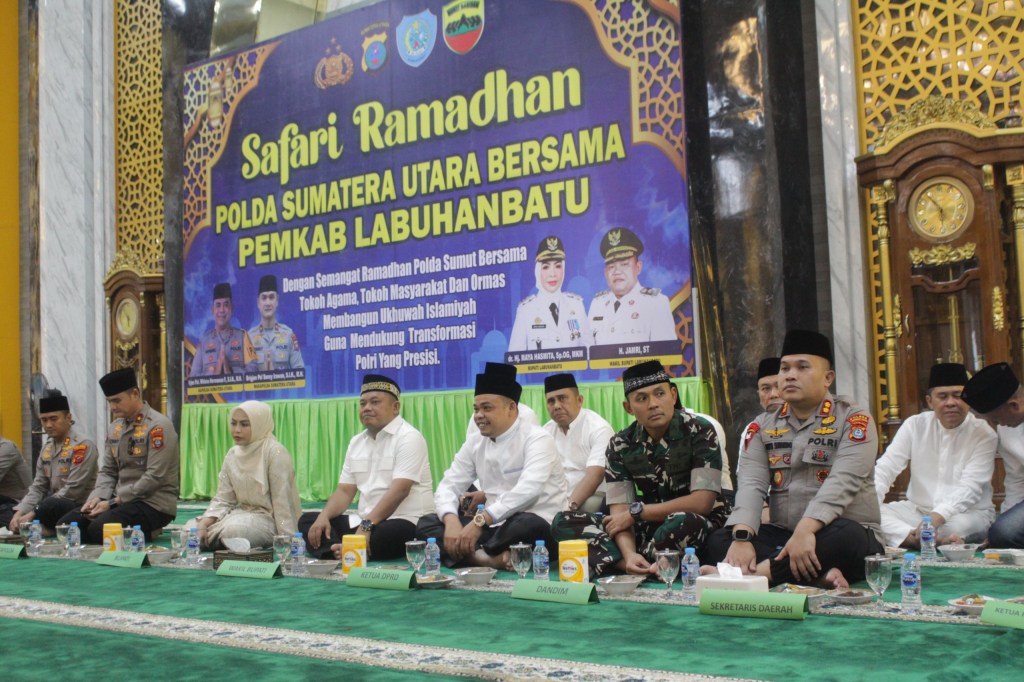 Safari Ramadhan tersebut turut dihadiri Wakapolda Sumatera Utara Brigjen Pol Sonny Irawan, S.I.K., M.H, Bupati Labuhanbatu dr. Hj. Maya Hasmita, Sp.OG., M.KM, Kapolres Labuhanbatu AKBP Wahyu Endrajaya, S.I.K., M.Si, Ketua DPRD Labuhanbatu Arjan Priadi Ritonga, Wakil Bupati Labuhanbatu H. Jamri, ST, serta sejumlah unsur Forkopimda, tokoh agama, tokoh masyarakat dan jajaran OPD Pemkab Labuhanbatu. Kehadiran berbagai unsur tersebut mencerminkan kuatnya sinergi dalam menjaga stabilitas wilayah selama bulan Ramadhan.