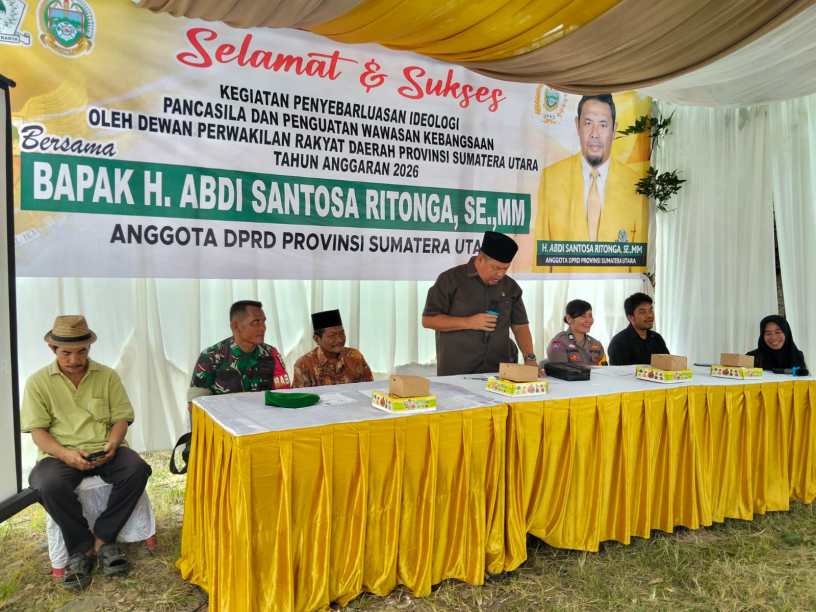 Labuhanbatu , kodim0209labuhanbatu – Babinsa Koramil 08/Rantau Prapat Kodim 0209/Labuhanbatu, Serma Jurus Kudadiri menghadiri kegiatan penyebarluasan ideologi Pancasila dan penguatan wawasan kebangsaan yang dilaksanakan oleh Anggota DPRD Provinsi Sumatera Utara H. Abdi Santosa Ritonga, S.E., M.M. Kegiatan tersebut berlangsung di Jalan Tugu Juang 45, Kelurahan Lobu Sona, Kecamatan Rantau Selatan, Kabupaten Labuhanbatu, Minggu (08/03/2026).