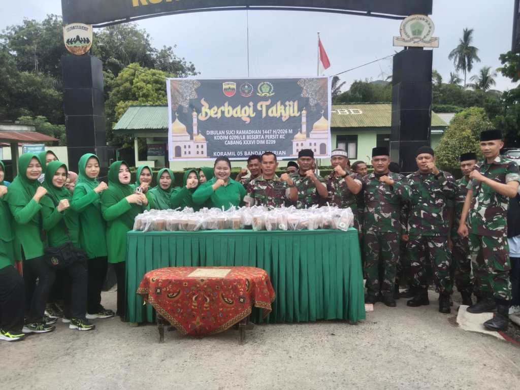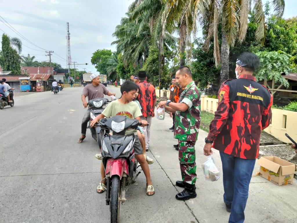 Labuhanbatu Utara , kodim0209labuhanbatu – Koramil 05/BD jajaran Kodim 0209/Labuhanbatu menggelar kegiatan berbagi takjil dan sembako kepada masyarakat serta para pengguna jalan yang melintas di depan Makoramil 05/BD, Desa Aek Pamingke, Kecamatan Aek Natas, Kabupaten Labuhanbatu Utara, Selasa (10/03/2026). Kegiatan sosial tersebut dipimpin langsung oleh Danramil 05/BD Kapten Inf Sabar Ifantri Simanjuntak bersama personel Koramil serta ibu-ibu Persit sebagai wujud kepedulian terhadap sesama di bulan suci Ramadhan.