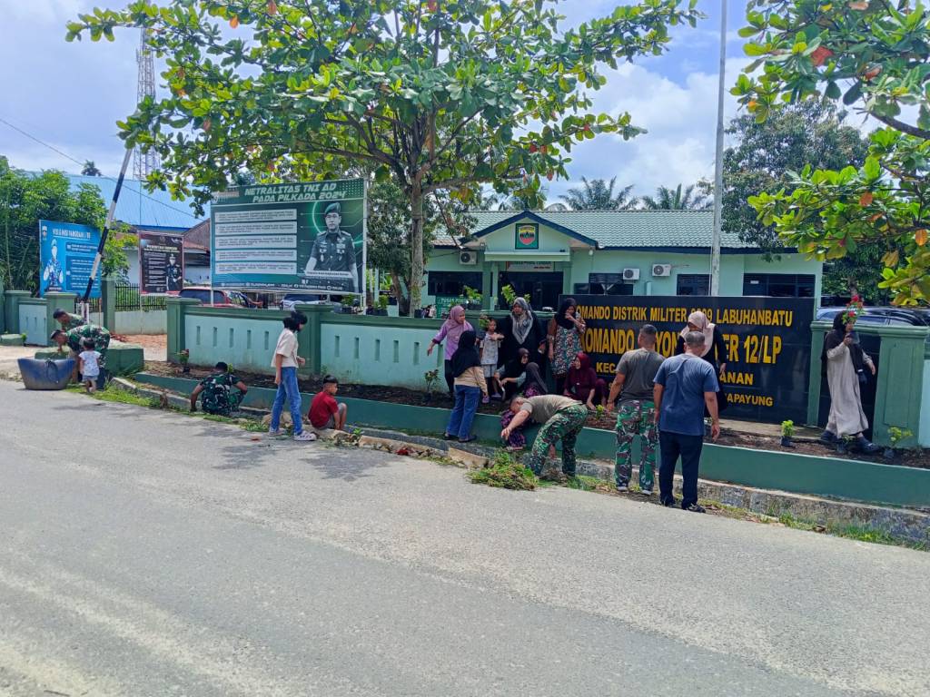 Labuhanbatu Selatan , kodim0209labuhanbatu – Kodim 0209/Labuhanbatu terus mendorong terciptanya lingkungan satuan yang bersih, rapi, dan nyaman melalui kegiatan gotong royong yang dilaksanakan jajaran Koramil. Seperti yang dilakukan Koramil 12/LP bersama ibu-ibu Persit dengan melaksanakan pembersihan dan penataan taman Makoramil di Kelurahan Langga Payung, Kecamatan Sungai Kanan, Minggu (15/03/2026).