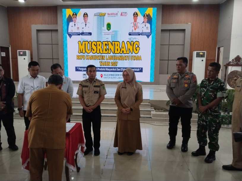 Labuhanbatu Utara , kodim0209labuhanbatu – Kodim 0209/LB melalui Koramil 01/AK terus menunjukkan komitmennya dalam mendukung pembangunan daerah. Hal tersebut tampak saat Danramil 01/AK yang diwakili Wadanramil Kapten Inf Arifin Sinaga menghadiri kegiatan Musyawarah Perencanaan Pembangunan (Musrenbang) RKPD Tahun 2027 yang digelar di Aula Ahmad Dwi Syukur, Kantor Bupati Labuhanbatu Utara, Selasa (7/4/2026).