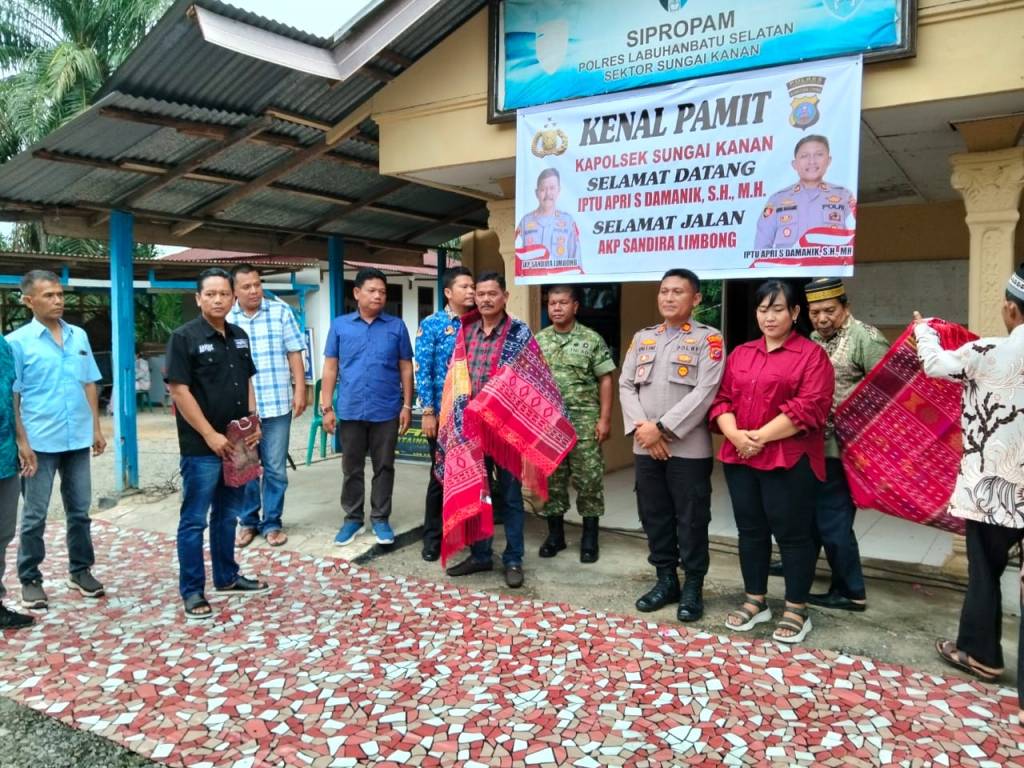 Labuhanbatu Selatan , kodim0209labuhanbatu – Danramil 12/LP Kapten Inf Mahyuddin Siregar, S.H menghadiri kegiatan kenal pamit Kapolsek Sungai Kanan dari AKP Sandira Limbong kepada Iptu Apri S. Damanik yang digelar di Mapolsek Sungai Kanan, Kelurahan Langga Payung, Kecamatan Sungai Kanan, Jumat (17/4/2026). Kehadiran Koramil 12/LP dalam kegiatan ini menjadi wujud nyata dukungan TNI dalam menjaga soliditas dan sinergi lintas sektor di wilayah binaan.