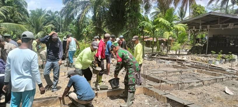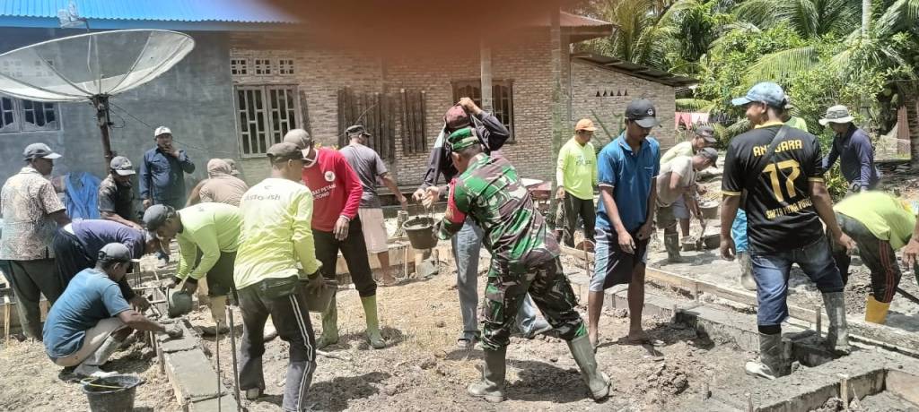Sejak pagi hari, suasana kebersamaan terlihat begitu kental. Warga bersama Babinsa bahu-membahu mengangkat material, menyusun rangka bangunan hingga merapikan lingkungan sekitar. Kehadiran Babinsa tidak hanya sebagai penggerak, namun turut terjun langsung di lapangan, menjadi contoh nyata semangat gotong royong dan kepedulian sosial di tengah masyarakat.